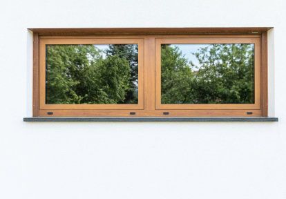 - De ramen uit aluminium werden door middel van een speciale techniek in een houtgelijkende lak uitgevoerd, die nauwgezet de houtstructuur imiteert. De eigenaars kozen in dit geval voor gouden eik.