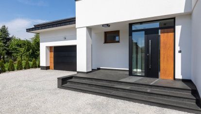 - Het op mekaar afgestemde buitenschrijnwerk maakt van dit huis een exclusief, uiterst modern object. Om te verkrijgen dat alle elementen aan mekaar aangepast zijn, is het goed deze producten bij een en dezelfde leverancier te bestellen. De bewoners van dit huis kozen ook een garagepoort uit de serie EUNIKA, zodat het uitzicht ervan ideaal aan de voordeur aangepast is. Het is ook goed om bij de aankoop van een poort aan enkele bijkomende elementen te denken, die het gebruikscomfort verbeteren. Als we twee wagens bezitten, is het goed om een brede poort te kiezen. Beide chauffeurs kunnen dan naar wens in en uit de garage rijden. Voor een probleemloos gebruik zorgt de motor met draadloze bediening. Als de garage niet zelfstandig staat, moet men ook aan een bijkomende isolatie denken. In dit geval is gekozen voor een poort met 60 mm panelen, zodat de garage in de winter niet afkoelt.