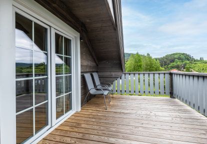 - De gasten die in dit huis verblijven, hebben een mooi terras ter beschikking, dat ze vanuit de zitkamer bereiken via een balkondeur. In de slaapkamers met balkon op de eerste verdieping kozen de investeerders voor dubbele balkondeuren met een vliegende middenstijl. Als men beide vleugels opent, staat er in het midden geen stijl in de weg. Men kan de volledige doorgang gebruiken om naar het balkon te gaan. En bij geopende deuren verhindert geen enkele stijl het zicht op de omgeving.