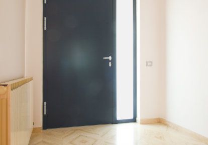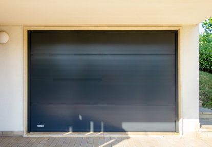 Deze aluminium, vleugeloverdekkende deur met korte deurtrekker werd in antracietgrijs uitgevoerd. In het zijlicht bevindt zich ondoorzichtig melkglas. - Sectionale poort
