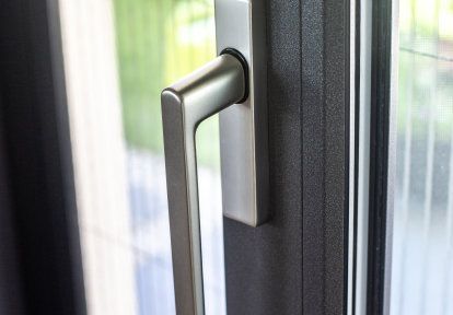 - Wanneer we dit huis betreden, kunnen we niet voorbij kijken aan de grote deurtrekker uit edelstaal. De brede trekker in een bijzondere vorm werd gemonteerd op een vleugeloverdekkende deur uit aluminium – model ELIGIA. De gladde vorm van de deur wordt onderbroken door horizontale frezen.