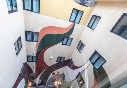 De warme, verzadigde kleuren van de binnenplaats met een indrukwekkende, opwaartse lift passen goed bij het gebruikte metaalwerk in een sterk zwarte sfeer. De stip op de ‘i’ zijn de details in de vorm van scharnieren en krukken in zilver of zwart. Het temperament van de investeerders komt tot uiting in de verscheidenheid aan composities waarin in het hele gebouw van ramen gebruik wordt gemaakt.