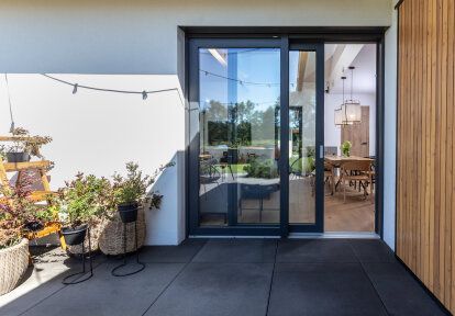Het huis is ontworpen voor een gezin van drie: ouders en hun zoontje die reeds op school zit. De ramen en deuren moesten goed afgestemd zijn op de moderne uitstraling van het gebouw en de interieurs - simpele maar elegante meubels, houten vloeren en open ruimtes. De klanten vonden het belangrijk om schrijnwerk te kopen dat gekenmerkt is door goede thermische parameters. Zij wilden dat hun ramen binnen in de kamers goed eruit zouden zien en hun functies goed zouden vervullen, maar dat alle elementen van het schrijnwerk op de gevel consistent en mooi eruit zouden zien.