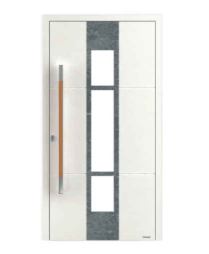 Intrigerend detail. Opvallend design in harmonie met de natuur. Een geraffineerde combinatie van ondoorzichtige panelen of panelen met mat glas ruiten en een natuursteendecor, aangevuld met een elegant RVS- of houten deurtrekker.