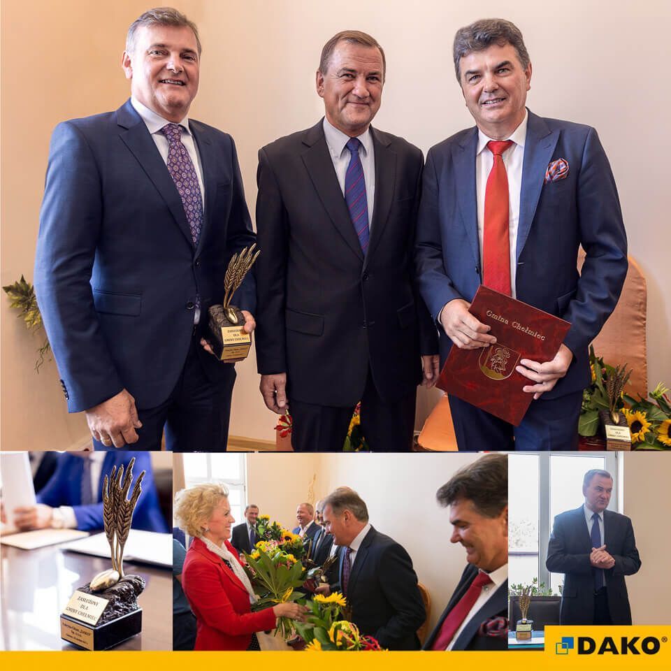 W ostatnim czasie firma DAKO aktywnie angażowała się na rzecz rozwoju Gminy Chełmiec, za co została uhonorowana podczas uroczystej sesji Rady Gminy, która odbyła się 18 września o godz. 12.00 w Urzędzie Gminy w Chełmcu. Statuetkę „Złotego Ziarna” oraz odznaczenie „Zasłużony dla Gminy Chełmiec” z rąk Wójta Gminy Chełmiec Barnarda Stawiarskiego oraz przewodniczącego Rady Gminy Chełmiec Józefa Zygmunta, odebrali osobiście Prezes Jerzy Studziński oraz Wiceprezes Janusz Studziński.