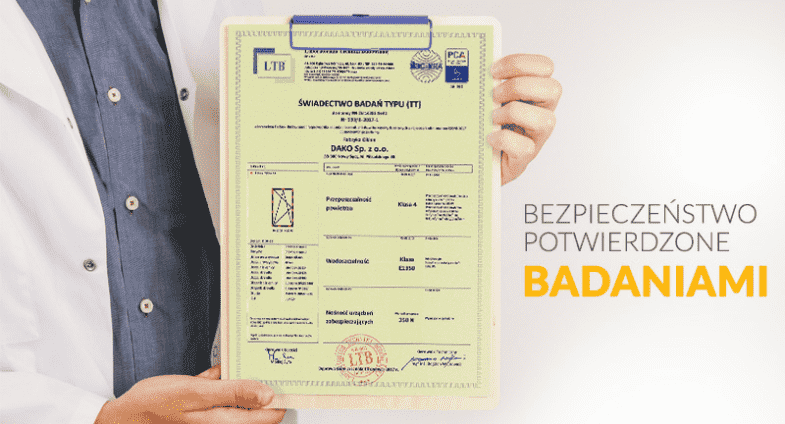 Najnowszy system okien drewnianych DAKO z profilami o grubości 78 mm został poddany niezależnym badaniom przeprowadzonym przez Laboratorium Techniki Budowlanej w Dąbrowie Górniczej, mającym na celu zweryfikować ich parametry w zakresie wodoszczelności, przepuszczalności powietrza oraz nośności urządzeń zabezpieczających. Okna osiągnęły rewelacyjne wyniki, potwierdzające ich najwyższą funkcjonalność.