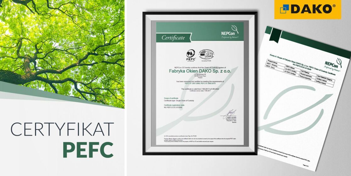Certyfikat PEFC przyznany stolarce drewnianej DAKO potwierdza, że drewno, a tym samym wytwarzane z niego produkty, pochodzą z właściwie zarządzanych lasów. Warunkiem otrzymania certyfikatu jest spełnienie szeregu wymogów z zakresu respektowania zasad gospodarki drzewnej opartej na ekologii i zrównoważonym rozwoju.