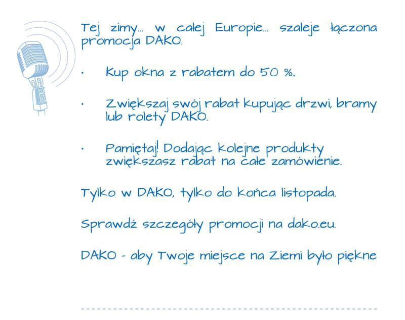 Reklama bazuje na światowej obecności marki DAKO, a jej treść informuje klientów o atrakcyjnej promocji – im więcej produktów zakupionych w ramach jednego zamówienia, tym wyższy rabat końcowy.