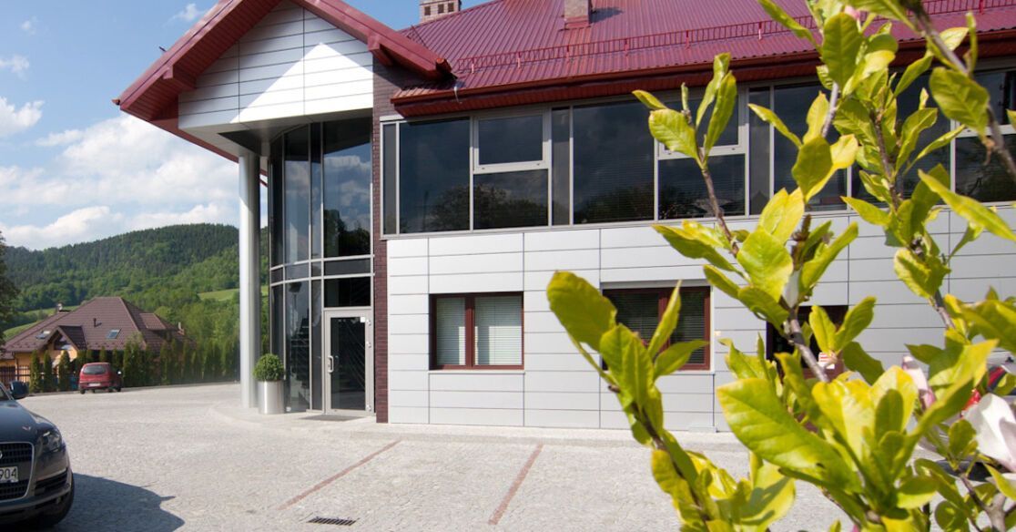 Drzwi i okna do siedziby hurtowni z artykułami elektrycznymi w Nowym Sączu przy zachowaniu spójności całej kompozycji musiały być dostosowane do realizacji dwojakich celów. Parter budynku pełni bowiem funkcję usługową, a na pierwszym piętrze znajdują się pomieszczenia biurowe. Kształt ścian w formie wielościany wymagał także, by niektóre okna i drzwi miały niestandardową, „wypukłą” formę.