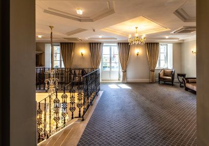 - Cała stolarka w dworze została wykonana w klasycznym białym kolorze, który podkreśla wyjątkową elegancję i historię budynku.