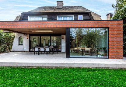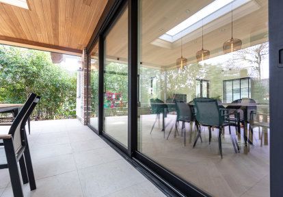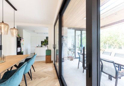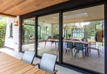 Stałe szklenie w kuchni zostało połączone narożnie z wykonanymi z aluminium drzwiami tarasowymi z serii DA-51 HST. Pozwoliło to na fizyczne otwarcie pomieszczenia na taras, a aluminiowy narożnik budynku nadał jego bryle minimalistyczny charakter.