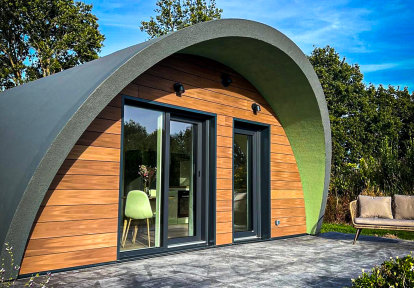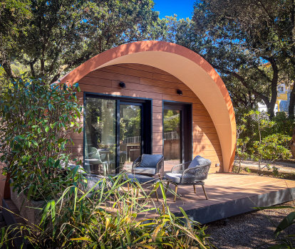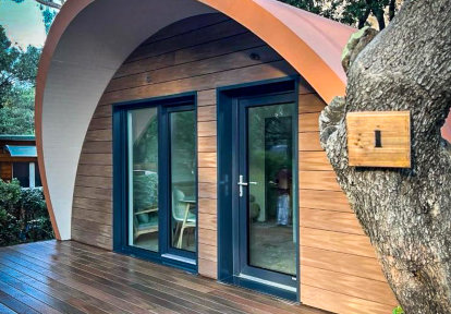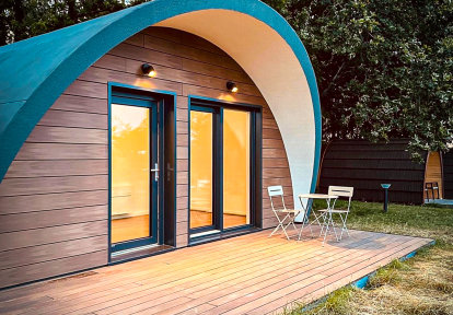 Innowacyjne écolodges – kompaktowe domki o niskiej emisji CO₂ to energooszczędne i przyjazne środowisku kabiny o półokrągłej geometrii. Dzięki zastosowaniu okien DAKO z wysokim wskaźnikiem izolacyjności, inwestor osiągnął w nich parametry cieplne i akustyczne optymalne dla komfortowego wypoczynku. Cały projekt opiera się na nowatorskiej konstrukcji z materiałów ekologicznych, zgodnych z normami RE2020.