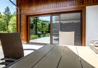 - Z dużego, jasnego salonu, który jest sercem domu oraz stylowej jadalni można wyjść na taras z miejscem do wypoczynku, grillem i basenem. W jadalni zastosowano drzwi tarasowe HST, które gwarantują płynne, bez barierowe przejście, co jest niewątpliwie dużym ułatwieniem dla gości. Natomiast w salonie zdecydowano się na okno balkonowe połączone ze stałym przeszkleniem