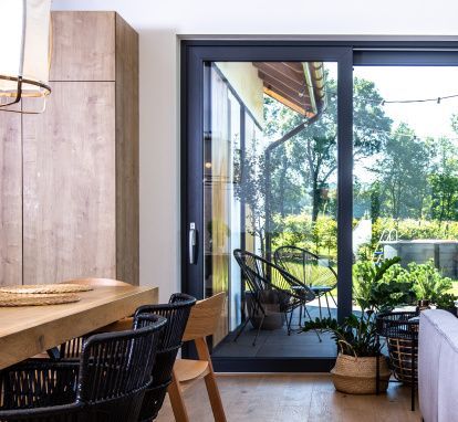 Drzwi tarasowe HST działają w oparciu o innowacyjny podnoszono-przesuwny system otwierania, pozwalający na realizację wielkogabarytowych przeszkleń. Wygodne otwieranie i zamykanie, a także możliwość zlicowania progu z posadzką, sprawia, że to niezwykle prestiżowe i eleganckie rozwiązanie dla osób poszukujących dużej ilości naturalnego światła. System otwierania delikatnie unosi skrzydło poruszające się na specjalnych rolkach, dzięki temu przesuwanie drzwi nie wymaga żadnego wysiłku.