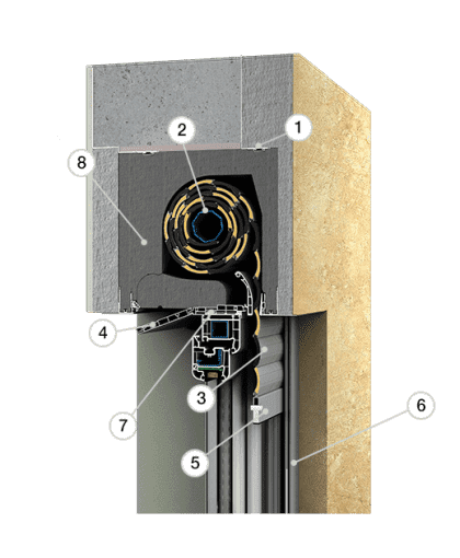 1 - Skrzynka rolety | 2 - Rura nawojowa | 3 - Pancerz | 4 - Klapa rewizyjna | 5 - Listwa dolna | 6 - Prowadnica | 7 - Profil adaptacyjny | 8 - Ocieplenie