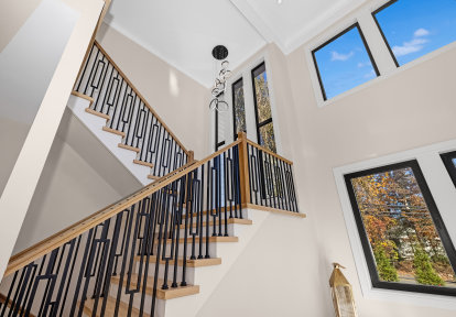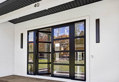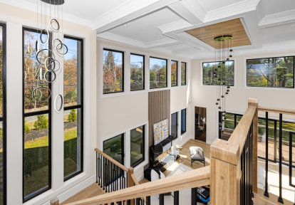 Redan vid första anblicken märks många olika glaspartier i hela huset: spektakulära fönster över 5 meter höga i trapphuset, rektangulära fönster i matrummet, och mindre – placerade i två våningar, över hela väggarnas bredd. 18 mm breda invändiga spröjs ger de övre fönstren en modern touch. Bilden kompletteras med monokromatiska altandörrar med olika öppningsriktningar som vetter mot den solbelysta verandan.