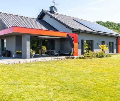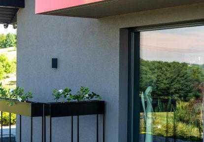 Det syns tydligt i detta projekt, där grå fönster och dörrar är en neutral bakgrund för en djärv, eklektisk inredning full av färger. Mörkgrå, som också används i fasadens finish och yttre jalusier, förstärker den röda detaljen i terrasstaket. Alla element skapar en ovanlig, men mycket konsekvent karaktär av byggnaden - perfekt återspeglar investerarnas temperament.