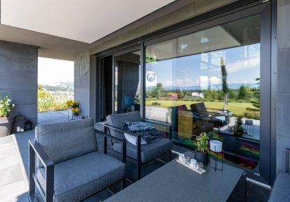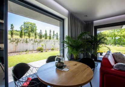 - Vart och ett av vardagsrummen har en separat terrass och en gemensam trädgård. I båda fallen är det möjligt tack vare HST-terrasdörrar. En låg tröskel, en stor glasyta och utmärkta värmeisoleringsparametrar gjorde den till den skjutdörr som valdes av investerare.