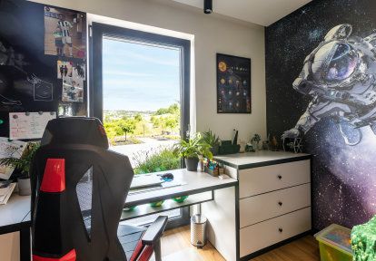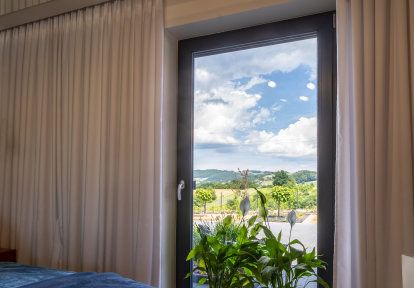 - Terrassdörrar i sovrummet är den perfekta lösningen för personer som bryr sig om att ha nära till naturen och möjligheten att gå ut i trädgården direkt efter uppvaknandet. Husägarna valde HKS tipp- och skjutdörrar för detta ändamål. Denna lösning ger inte bara en bred passage, utan också ventilation av rummen, tack vare möjligheten att luta bågen.