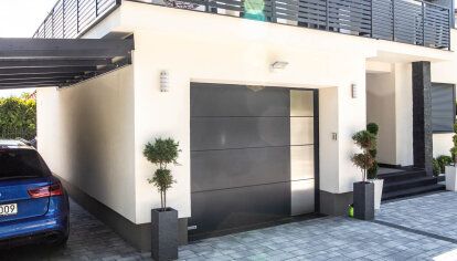 - En garageport med 60 mm tjocka paneler i antracitgrått (i samma färg som fönstren och entrédörren) har installerats i enkelgaraget. Utmärkande för kompositionen TAIDA är aluminiumdetaljer. En vertikal remsa av borstat rostfritt stål ger huskroppen karaktär och fångar blickar.