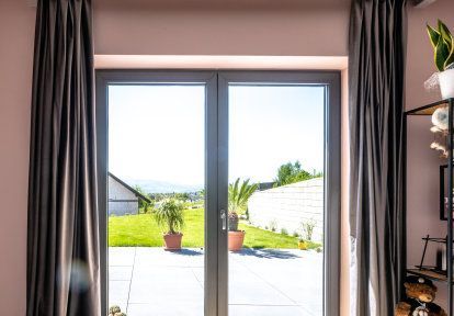 - Tillgång till terrassen från köket, husägarnas huvudsovrum och vardagsrummet är möjlig tack vare av enkel- och tvåbladiga balkongdörrar. I gymmet på första våningen valde investerarna även ett dubbelskjutigt balkongfönster, med skillnaden att det öppnar mot en balkong av fransk typ.