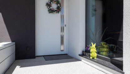 - Den karakteristiska handledaren i rostfritt stål är det första vi uppmärksammar när vi går in i huset. Den monterades på en överdragsdörr gjord av aluminium - ELIGIA-modell. De kännetecknas av en slät struktur som bryts av tvärgående prägling.