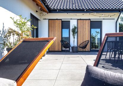 När det gäller ytterdörrar valde kunderna en modern ingångsdörr av aluminium - modellen NOEL. Den gråa ingångsdörren är anpassade till fönstrens färg och är dessutom utrustade med sidoljus som släpper in ljuset i förstugan bakom dörren och ett ovanligt draghandtag i trä.