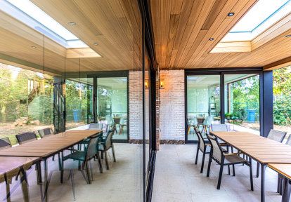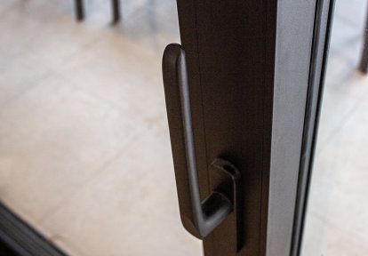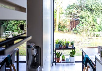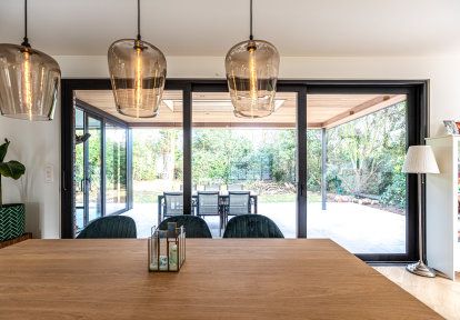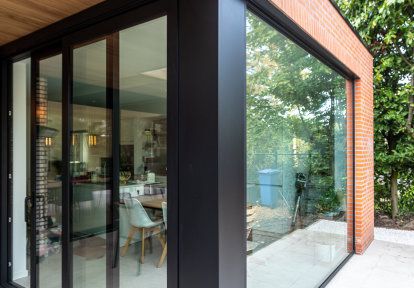 Fast glas i köket har kopplats ihop i hörnet med aluminium terrassdörrar från DA-51 HST-serien. Detta möjliggjorde den fysiska öppningen av rummet till terrassen, och byggnadens aluminiumhörn gav dess kropp en minimalistisk karaktär.