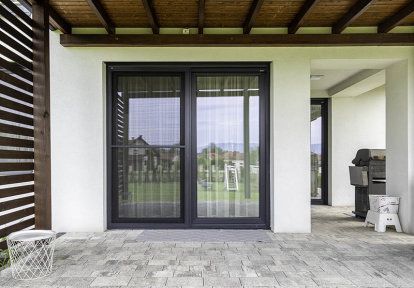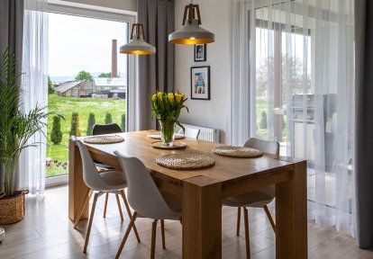 - Lutnings- och skjutdörrar (HKS) garanterar problemfri tillgång från vardagsrummet till terrassen på båda sidor. Höga isoleringsparametrar är inte de enda fördelarna med denna lösning. Utformningen av dessa altandörrar gör att du kan luta den rörliga bågen, vilket säkerställer optimal ventilation utan att behöva öppna den helt. Skjutmyggnät monterades också i vägdörrarna.