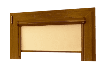 Rullgardinstyget som är styrt i aluminiumstyrskenor ligger tätt mot fönsterramen och ger fullständig mörkläggning av rummet.