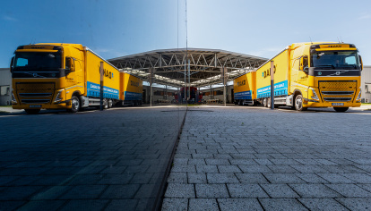 En väl utbyggd transportflotta med gula och blå lastbilar kör regelbundet över hela Europa med stöd av ett innovativt system för transportövervakning och SMS-meddelanden som säkerställer full kontroll och effektivt informationsflöde. Den logistiklösning som också används som standard är hissar och lossningsvagnar för bekväm och säker lossning av DAKO-produkter.