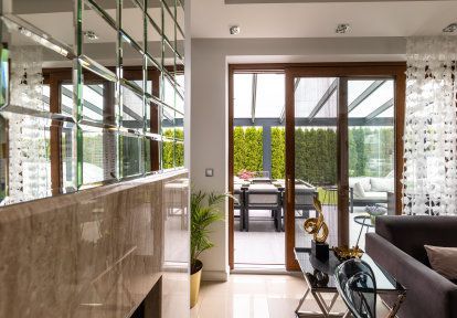 - Investori navrhli pri dome veľkú, presklenú terasu, ktorá sa stáva miestom stretávania sa rodiny až do neskorých večerných hodín. V priechode medzi interiérom domu a terasou boli osadené terasové dvere HST. Zdvižno-posuvný systém tejto konštrukcie zaisťuje vysokú funkčnosť a pohodlné zatváranie a otváranie dverí. Vďaka kombinácii terasových dverí HST a dvojkrídlového balkónového okna je obývačka počas dňa dokonale presvetlená.
