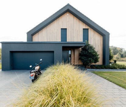 V dvojgaráži bola namontovaná 5 m široká brána s hladkou antracitovo sivou výplňou (RAL 7016 - rovnaká ako farba okenných výrobkov a vchodových dverí). Keďže fasáda garáže je takisto ukončená vo veľmi podobnom odtieni, brána na seba napriek svojim veľkým rozmerom príliš nevzbudzuje pozornosť.