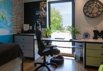 - Terasové dvere v spálni sú dokonalým riešením pre ľudí, ktorým záleží na blízkosti prírody a možnosti vyjsť do záhrady hneď po prebudení. Majitelia tohto domu si na tento účel zvolili sklopno-posuvné dvere HKS. Toto riešenie zabezpečuje nielen široký priechod, ale aj vetranie miestností vďaka možnosti sklopenia krídla.