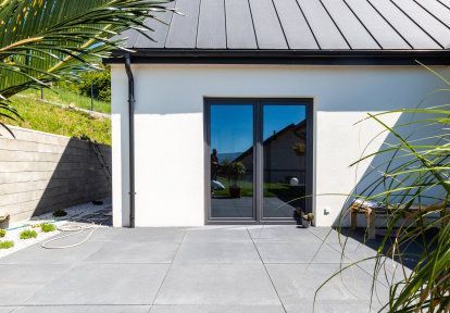 - Zámerom majiteľov tejto nehnuteľnosti bolo zvoliť si výrobky v nejednotných farbách. Najdôležitejšie pri rozhodovaní o farbe okien, vchodových dverí a garážovej brány však bolo, aby boli všetky tieto prvky vo vzájomnom súlade. Na vchodové dvere investori zvolili bielu farbu, na garážovú bránu antracitovú a na okná a terasové dvere neštandardnú - tmavosivý alux, ktorý v kombinácii so sivými kľučkami zvýrazňuje moderný dizajn celku.