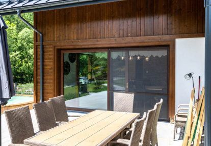 - Z veľkej svetlej obývacej izby, ktorá je srdcom domu a štýlovej jedálne, môžete vyjsť na terasu s miestom na odpočinok, grilovaním a bazénom. V jedálni boli použité terasové dvere HST, ktoré zaručujú plynulý bezbariérový priechod, čo je nepochybne veľká výhoda pre hostí. V obývacej izbe však bolo zvolené balkónové okno spojené s pevným zasklením
