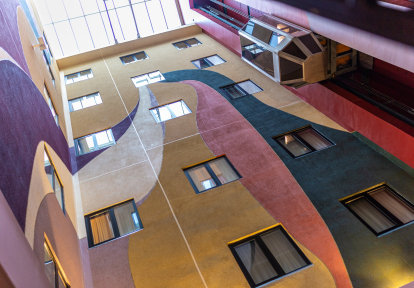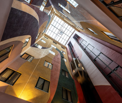 Teplé nasýtené farby vnútorného nádvoria s efektným výťahom pnejúcim sa dohora krásne ladia použité okná a dvere s charakteristickým intenzívne čiernym odtieňom. Bodkou na „i“ sú detaily – strieborné alebo čierne pánty a kľučky. Temperament investorov odzrkadľuje rôznorodosť kompozícií, v ktorých boli použité okná v rámci celého objektu.