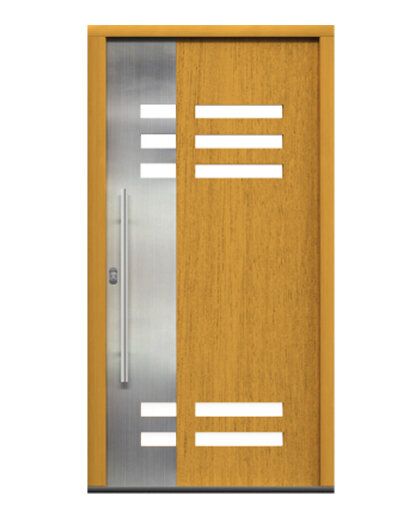 A composition merging the cool elegance of stainless steel details with horizontal glazing binds together this complex, inspiring harmony. It's a multi-level play of geometries, materials and colours, where nothing is obvious and everything is ultra-modern. The unobvious incorporation of natural materials combined with cold stainless steel is a proposal for sophisticated connoisseurs of exciting duos.