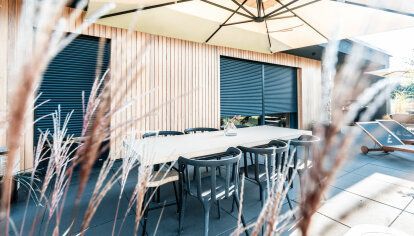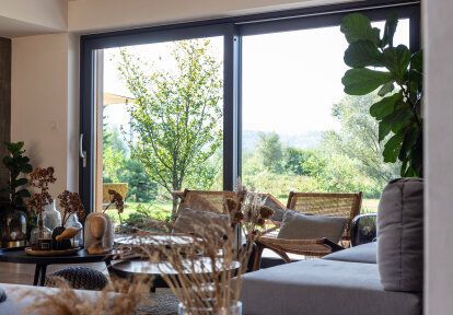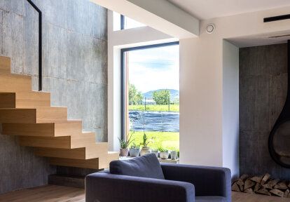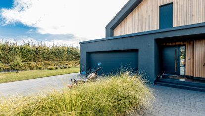 A 5 m wide gate with a smooth anthracite grey panel (RAL 7016 - identical to the colour of the window joinery and entrance door) was installed in the double garage. As the facade of the garage is also finished in a very similar shade, the gate, despite its considerable size, does not attract much attention. Thanks to the use of a drive, operating the gate is comfortable and functional for the users. When it comes to the front door, the investors decided on a classic, simple design of aluminium external doors, which fits perfectly into the home and, at the same time, reflects the character of the hosts, who value minimalism and nature. Aluminium doors mean solid workmanship and durability, combined with an attractive design.