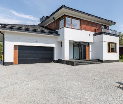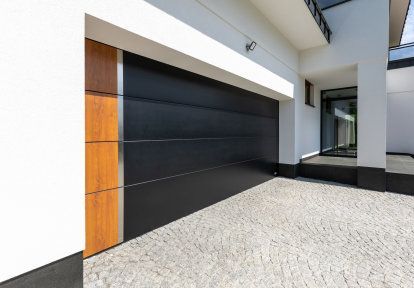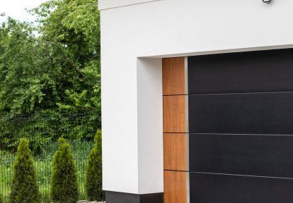 - Joint design of joinery used throughout the property makes it look modern and exclusive. In order to make sure that all elements match, it is better to use one joinery manufacturer. The owners wanted to complement the front entry door by using a garage door in the same variation (EUNIKA). It is important to keep few things in mind when choosing garage doors in order to ensure best comfort of use. For owners of 2 cars, its better to choose double garage door so both cars can easily access. Wireless automatic control also contributes towards the convenience. Moreover, the garage should be located in a body of a building and adequately insulated. 60 mm thick garage door, chosen by the owners, guarantees phenomenal thermal insulation, thus making inside of the garage protected from heat loss during winter.