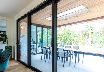 The choice of aluminum as the material from which the joinery is made allows you to create spectacular glazing. An example of using the structural possibilities of aluminum is fixed glazing in the kitchen. The choice of the DA-65EF I+ aluminum system allowed the owners to maintain proper interior thermals and obtain a modern visual effect.